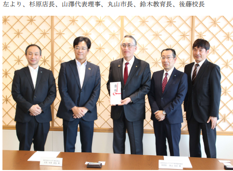 酒田市役所の市長室で行われた寄贈式には丸山至酒田市長、鈴木和仁酒田市教育長、後藤司酒田市立松原小学校校長、ヤマザワ教育振興基金より山澤廣代表理事、杉原淑弘ヤマザワ東大町店長らが出席した。