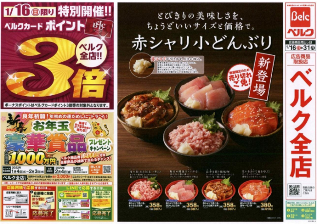 ベルクでは、2022年1月5日に豊洲市場で行われた新春恒例の初競りで、一番高い金額で落札された“一番まぐろ”に次ぐ重量の200kg級の青森県大間産の本まぐろを競り落とした。“いいまぐろをこれからも地域のお客様に届けたい”という想いを表現するために、B3サイズ全面に迫力あるまぐろの写真と「ベルクまぐろ宣言‼」と力強いメッセージを掲載。2022年1月16日に約220万部の新聞折込をした。