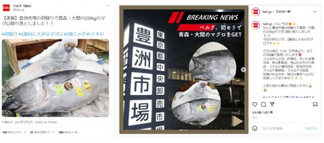 ベルクでは豊洲市場の初競りでまぐろを競り落とすところから TwitterやInstagramでリアルタイムで発信、販売店舗はLINEでその日中に発信するなど顧客に届くまでの裏側やストーリーを伝えるためにSNSを活用した。