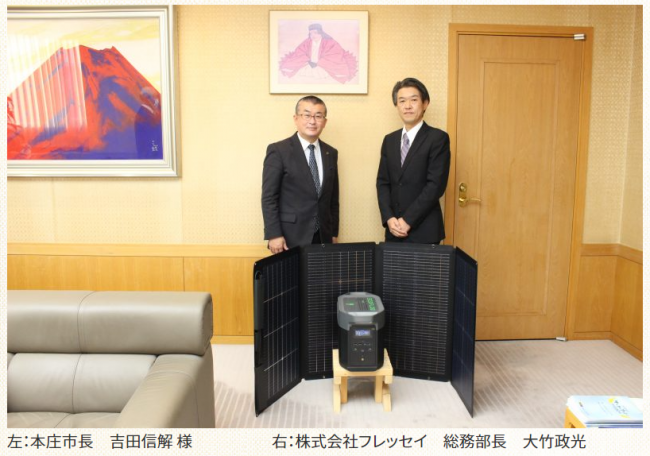 同社のフレッセイ児玉店の店頭で寄せられた募金を災害用ポータブル電源とソーラーパネル各1台を寄贈した。