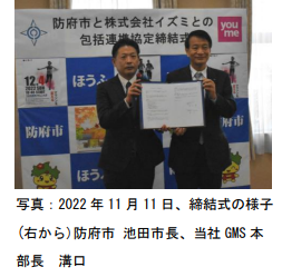 流通スーパーニュース > CSR > イズミnews|山口県防府市と包括連携協定 イズミnews|山口県防府市と包括連携協定 CSR / 2022年11月17日 ツイート (株)イズミ(広島県広島市、山西泰明社長)と山口県防府市(池田豊市長)は、11月11日(金)に地域社会の活性化及び市民サービスの向上を図ることを目的に、包括連携協定を締結した。 連携・協定の内容として、中心市街地の活性化、地域防災への協力、高齢者及び障がい者の支援、地産地消の推進及び販売促進などの事項について、相互に連携し、協働して取り組むとしている。 2022年11月時点でイズミは防府市内に1店舗(ゆめマート三田尻店)を展開している。 ツイート