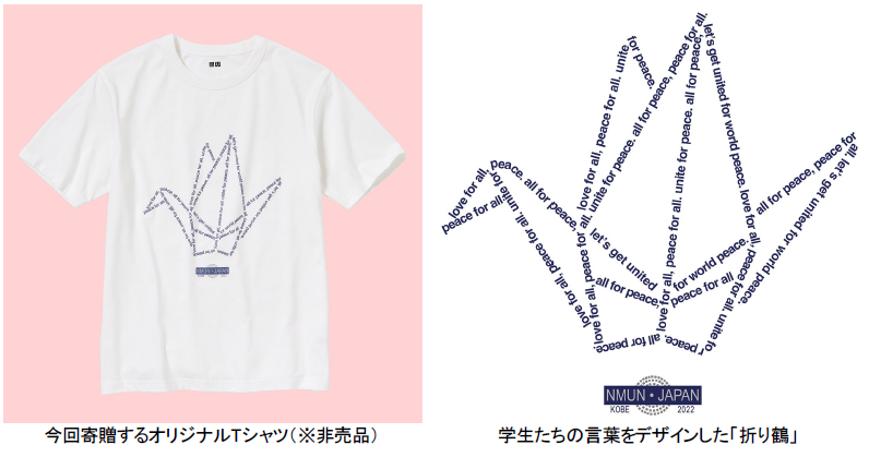 ユニクロはこの取り組みに賛同し、参加する大学生たちから「平和」からイメージした言葉を集めた。その言葉を「折り鶴」としてデザインし、オリジナルTシャツを製作した。