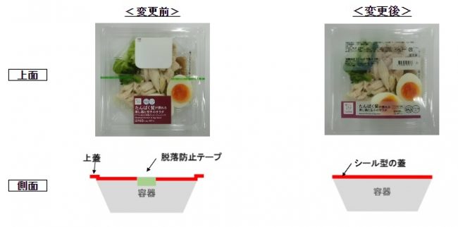これまでは、容器と蓋をはめあわせる「嵌合(かんごう)蓋」を使用し、脱落防止のために補助テープで固定していた。今後は、上蓋をシールタイプに変更することで、蓋と補助テープ部分のプラスチック使用量を抑える。