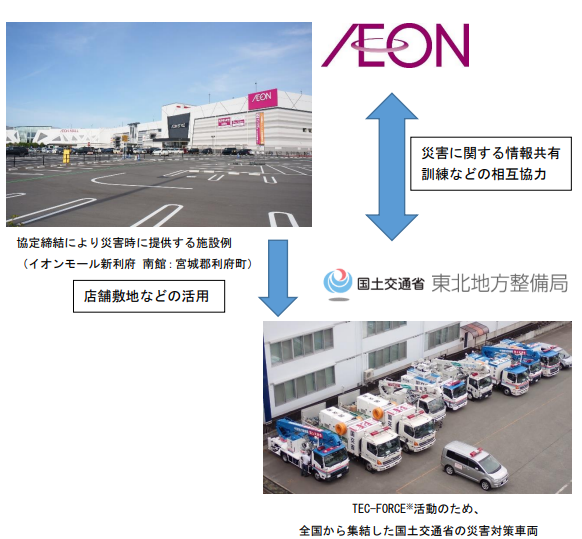協定によって、イオンは、東北地方整備局の要請に基づき、災害対応時の活動に必要な拠点となる駐車場・店内施設のスペースおよび食料品、資機材などを提供する。