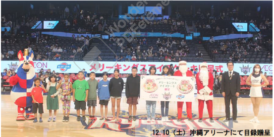 イオン琉球(株)(沖縄県島尻郡南風原町、鯉渕豊太郎社長)は、沖縄バスケットボール(株)(沖縄県沖縄市、白木享社長:以下「琉球ゴールデンキングス」)、フォーモストブルーシール(株)(沖縄県浦添市、山本隆二社長:以下「ブルーシール」)と、「沖縄の子どもたちを HAPPYに」をコンセプトにコラボレーションしたクリスマス用アイスケーキ50個を、「おきなわ子ども未来ランチサポート」を通じて県内の “こどもの居場所” などにクリスマスプレゼントとして寄付する。12月10日(土)、「琉球ゴールデンキングス」のホームゲームに子どもたち100名を招待し、プレゼントするメリーキングス アイスケーキの目録を贈呈した。
