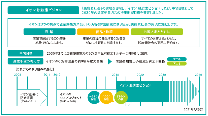 イオンでは、店舗運営におけるエネルギー使用や物流での燃料使用といった事業活動を通じて地球温暖化に影響を与えていることから、いち早く「脱炭素社会の実現」を重点課題として掲げている。具体的なCO2排出量削減目標を定めて、企業としての成長を維持しながら事業の過程で発生する温室効果ガスを削減してきた。