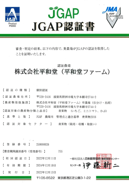 平和堂ファームでは、安全安心な農産物の出荷や農場で働く社員の安全確保、また、新規就農者支援に活用するためJGAP認証取得に向けた生産工程管理に取り組んできた。JGAP認証はミニトマト、いちご、かぶの青果物に関する分類で取得した。