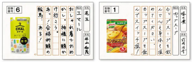 テストは解答者となる各メーカーのサミット担当者へ、「問: あなたがおすすめする自社商品を題材に、受験生がクスっとなるような応援メッセージを40字以内で書きなさい。」と出題をした。たとえば、味の素の担当者はカップスープを題材に「カップスープを飲んで心も身体も温めてください。カップスープを飲んでスイッチ温!」、花王の担当者はエマールを題材に「おしゃれ着でおめかし。神様に願かけ行こう。あっ!合格祈願の絵馬、ある!」と解答している。
