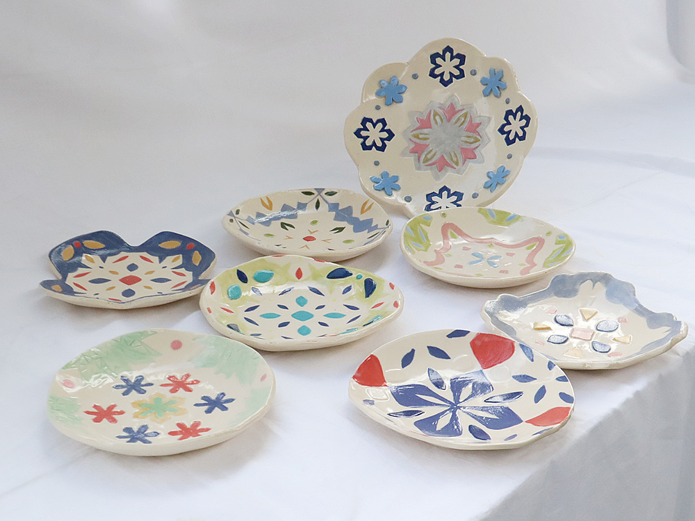 同校の高校2年生7人が平和への祈りを込め、平和記念公園の折り鶴灰を活用して制作した陶器製のトロフィー8作品が完成した。