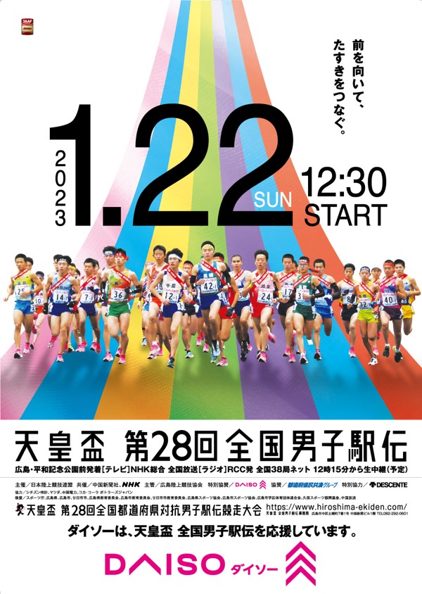 (株)大創産業(広島県東広島市、矢野靖二社長)は1月22日(日)に開催される「天皇盃 第28回全国都道府県対抗男子駅伝競走大会(主催:日本陸上競技連盟、略称:天皇盃 全国男子駅伝)」のメインスポンサーを務めている。