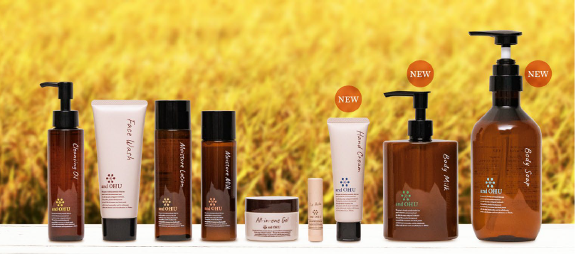 「and OHU」シリーズは、ハンドクリーム、ボディミルク、ボディソープ、クレンジングオイル、フェイスウォッシュ、モイスチャーローション、モイスチャーミルク、オールインワンジェル、リップの9商品。