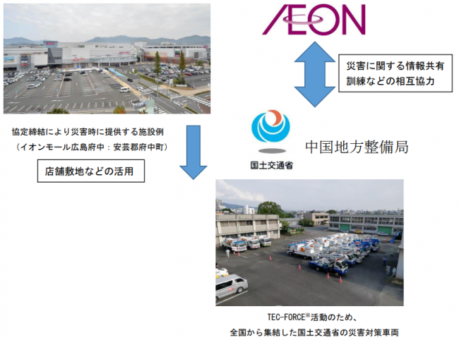 協定によって、イオンは、中国地方整備局の要請に基づき、災害対応時の活動に必要な拠点となる駐車場・店内施設のスペースおよび食料品、資機材などを提供する。