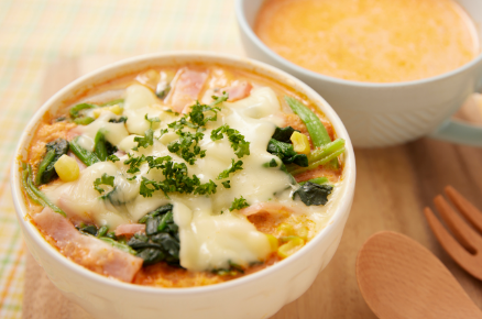「冷蔵庫で余りやすい牛乳、卵を手軽に美味しく消費することが出来るレシピです。すべての材料を1つのお皿で混ぜ、電子レンジで加熱するだけなので、忙しい朝にもぴったりです。冷凍食品を使用することで野菜の端材を捨てず、食べきれる量のためフードロス削減にも繋がります」
