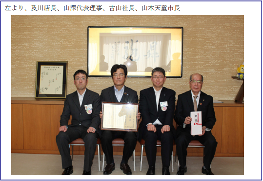 天童市役所で行われた寄贈式には出席者として、天童市からは 山本信治市長、新関茂副市長ら7名、ヤマザワ教育振興基金からは 山澤廣代表理事、古山利昭ヤマザワ社長、及川鉄平長岡店店長ら5名が出席した。