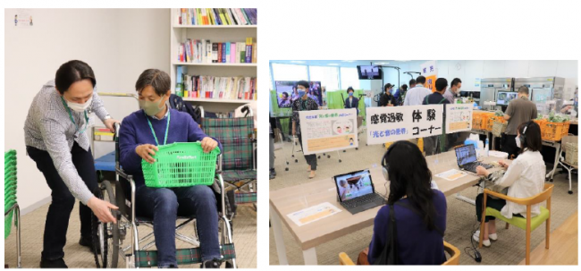 左は車椅子体験、右は聴覚過敏体験を受講中