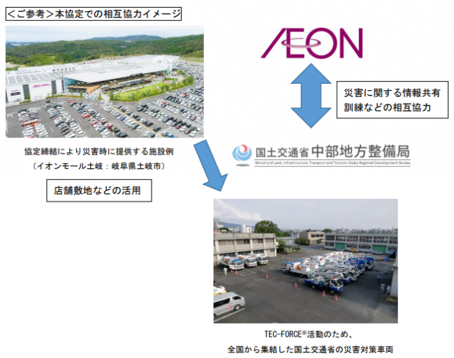 イオンは、中部地方整備局の要請に基づき、整備局管内の約130店舗の商業施設の中から、被災地域に近い場所で、災害対応時の活動に必要な拠点となる駐車場・店内施設のスペース及び食料品、資機材などを提供する。