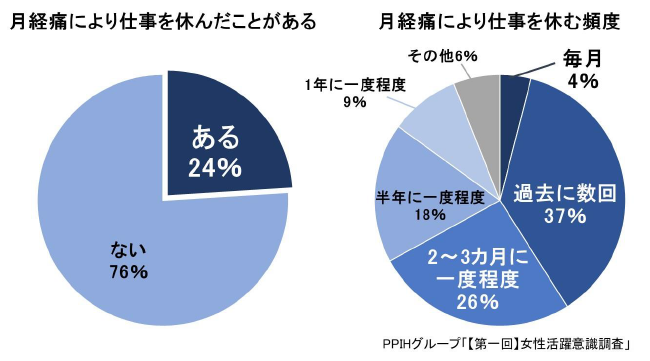 同社女性社員を対象とした調査では、約1/4が月経痛によって仕事を休んだ経験があることが分かった。その中でも、2~3カ月に一度以上休むという回答は30%に上った。