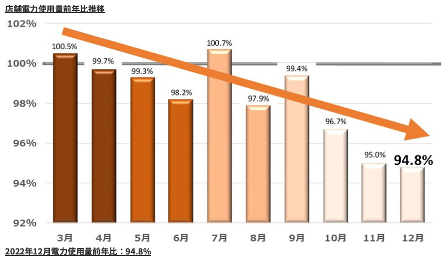 (株)ファミリーマート(東京都港区、細見研介社長)は、2022年2月から節電対策のプロジェクトチームを立ち上げ、急速な社会環境の変化や電力需給のひっ迫時において、節電に繋がるさまざまな対策に取り組んでいる。2022年12月の電力使用量の前年比は 94.8%となり、節電の効果が認められる。