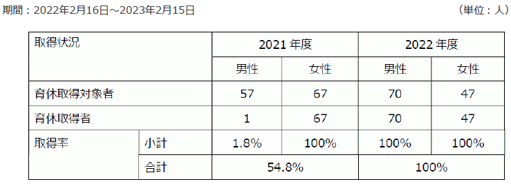 これにより、男性が育休取得を機に家事や育児に積極的に取り組むことで、女性の就業継続につながること、また、生活者として家事や育児に取り組むことで、その経験や知識が育休後の業務につながることを期待している。