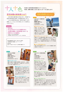 平和堂グループ報「はと」では、育休制度の説明や男性取得者の育休レポートを掲載し、情報発信男性の育休取得についての感想や、これから育休を取得する男性へ向けてのアドバイス等を掲載し、育休取得推進のための環境整備に取り組んでいる。
