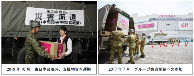 イオンは自衛隊との協力関係では、東日本大震災において、水や食料、毛布などの緊急支援物資の運搬協力要請や、イオン気仙沼店など被災エリアの店舗駐車場を復旧・復興のための工作車両の基地として提供した。