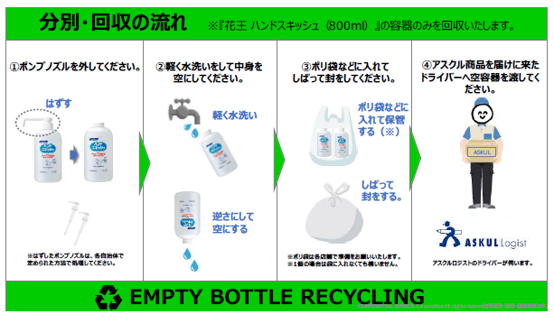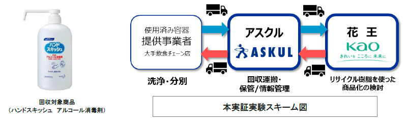 対象商品は「花王 ハンドスキッシュ アルコール消毒剤 800ml」で、ASKUL サービスの商品配達時に回収依頼があればその場で回収し、配達ドライバーに、袋に入れて封をした状態で回収容器を渡す。東京都千代田区の大手飲食店チェーン(提供事業者)から開始し、東京都21区に拡大展開する予定だ。