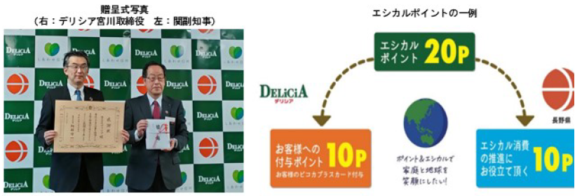 デリシア、ユーパレットなどのデリシア店舗において、デリシアポイントの「ピコカプラスカード」を提示して「エシカルポイント」対象商品を購入すると、ポイントが付与される。そして、そのポイント同等額が「エシカル消費」推進のために長野県に寄付される。