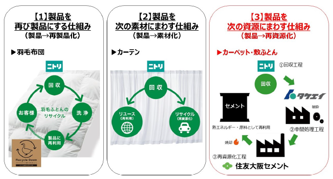 「カーペット・敷ふとん」は、処分に困る製品の第1位・第2位にラインクインするものだったが、製品の特性として分別困難という課題があり、ニトリがこれまでに構築した仕組み(下図【1】【2】)では対応できなかった。しかし、(株)タケエイ(東京都港区、阿部光男社長)と住友⼤阪セメント(株)(東京都港区、 諸橋央典社長)と協業することで、「カーペット・敷ふとん」を再資源化する仕組み(下図【3】)を構築することができるようになった。