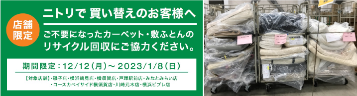 (株)ニトリ(北海道札幌市北区、武田政則社長)は、顧客から回収したカーペット・敷ふとんを再資源化する仕組みを構築し、2022年12⽉12⽇(⽉)〜2023年1⽉8⽇(⽇)の約4週間、神奈川県のニトリ8店舗で回収した。
