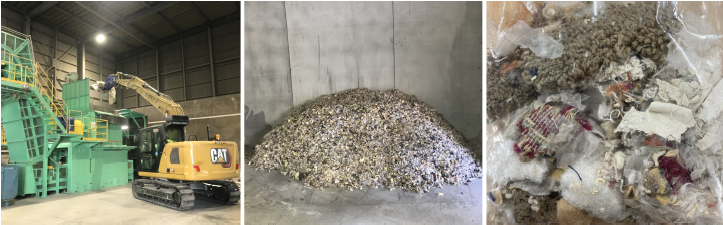 【3】「製品を、次の資源にまわす仕組み」では、①不要になったカーペット・敷ふとんを回収(ニトリ)、②中間処理として破砕(タケエイ)、③破砕物を熱エネルギーとして活⽤した上で、そこで発⽣した灰を捨てずに、さらにセメント原料として活⽤(住友⼤阪セメント)という3つの⼯程で3社が協業した。