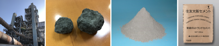 中間処理(破砕)後に、住友⼤阪セメント⼯場に持ち込み、セメント製造における約1450℃の焼成⼯程の熱エネルギーとして利⽤する。焼成後の灰になった成分(灰分)や残渣は、原料に再利⽤され、セメント製品に⽣まれ変わる。この工程では⼆次廃棄物の発⽣もなく、最終処分場の延命にもつながる。