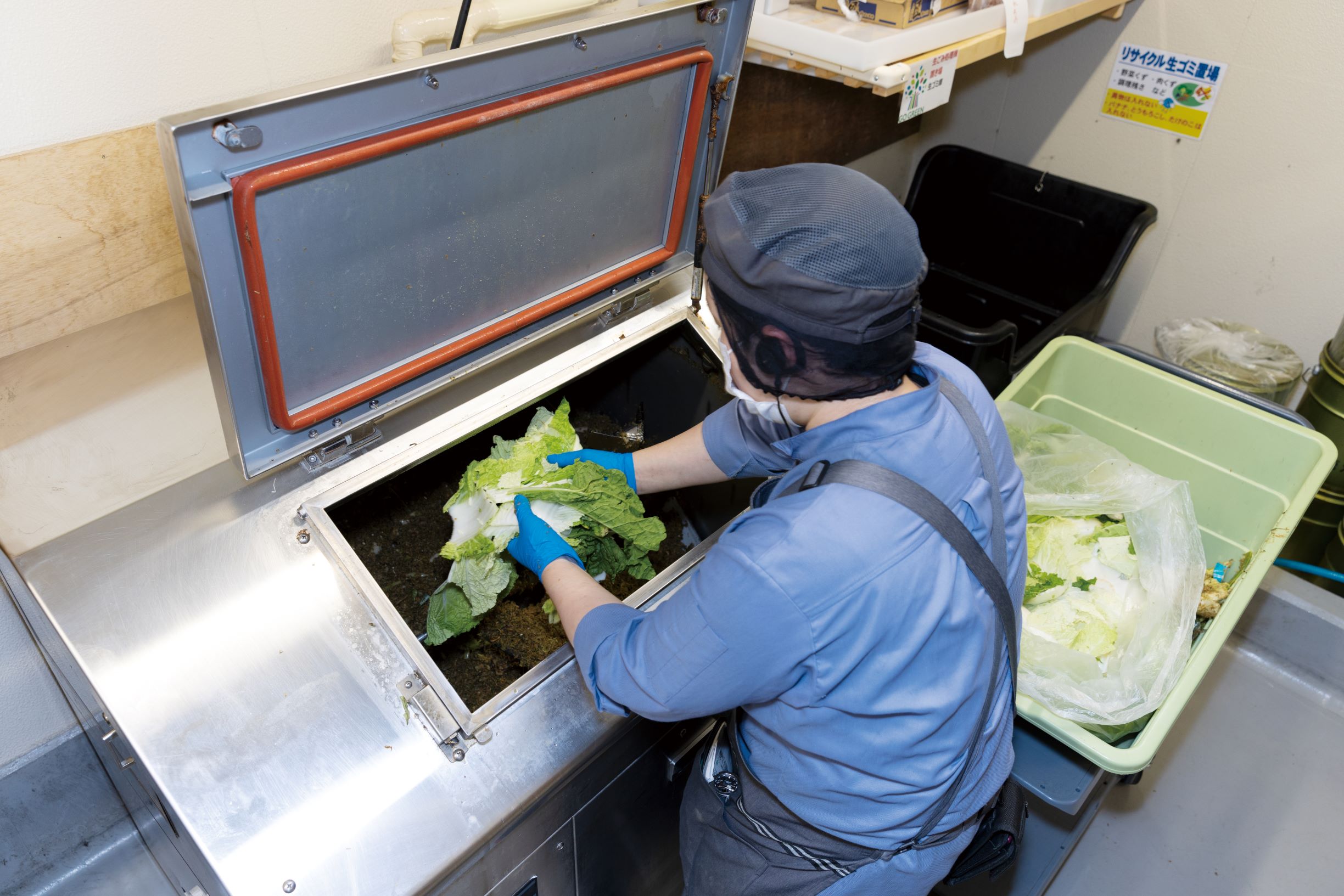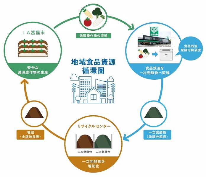 サミットはNTTビジネスソリューションズ(株)の「地域食品資源循環ソリューション」を活用して、2020年4月から店舗で発生した食品残渣を食品残渣発酵分解装置で処理している。たとえばバックヤードでの商品製造の際に1日1店舗あたり約100キロの食品残渣(主に野菜加工時に発生する野菜残渣)が発生する。