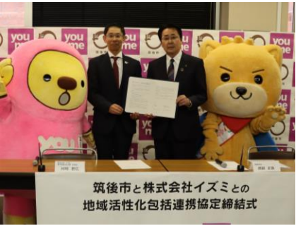 (株)イズミ (広島市東区、山西泰明社長)は4月14日(金)に福岡県筑後市(西田正治市長)と、また4月19日(水)に山口県宇部市(篠﨑圭二市長)と、地域の活性化および市民サービスの向上を図ることを目的に、地域活性化包括連携協定を締結した。