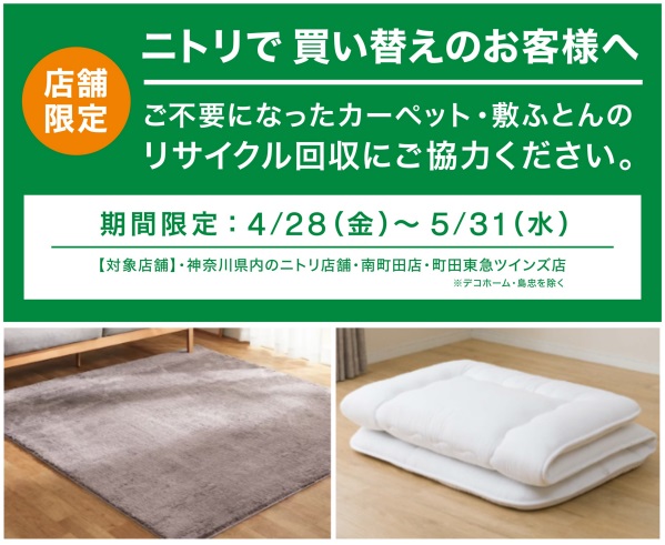 対象店舗は神奈川県内のニトリ店舗、南町⽥店、町⽥東急ツインズ店(デコホーム・島忠を除く) の合計27店舗。期間中、ニトリで対象商品を合計9900円(税込み)以上購⼊の顧客限定で実施する。回収は、神奈川県内・町⽥市内で⼤型家具の配達予定がある顧客に限られる。