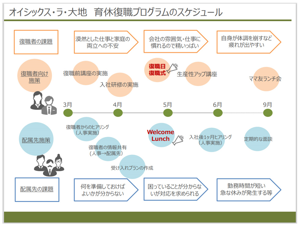 同社では「復職式」にとどまらず、復職者が育児や家庭と仕事を両立し、働くイメージをもったうえで復職できるよう、立ち上がりを支援し、パフォーマンスを発揮しやすくするためのプログラムや、受け入れ先となる組織への支援策を複数用意しており、復職率は毎年ほぼ100%となっている。