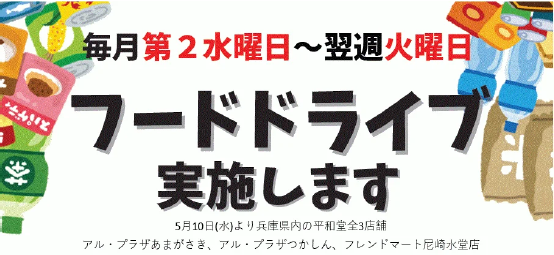 (株)平和堂(滋賀県彦根市、平松正嗣社長)は、社会福祉法人尼崎市社会福祉協議会(松原一郎理事長)と連携し、兵庫県内全3店舗において、5月10日(水)からフードドライブを開始した。