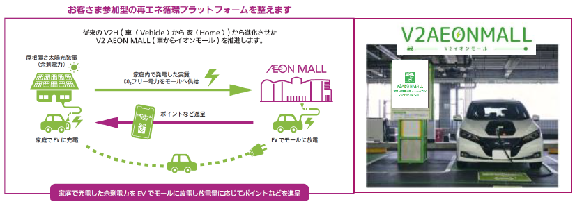 このサービスは、従来の V2H(車[Vehicle]から家[Home])から進化させた V2AEON MALL(車からイオンモール)のサービス。家庭で発電した電力(余剰電力)を EV を介してモールに放電すると、脱炭素社会実現に向けた取り組み協力のお礼としてポイントがもらえる。顧客参加型の再エネ循環プラットフォームを整えることで、家庭での再生可能エネルギー活用を選択するきっかけづくりに寄与する。