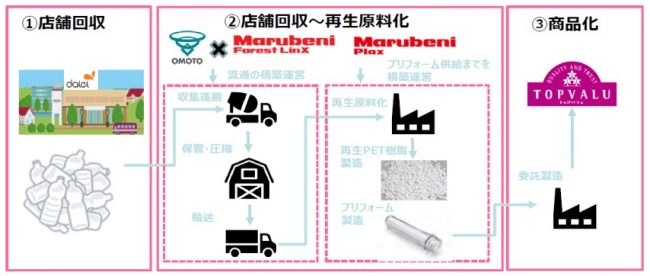 回収したペットボトルは再生PET樹脂となり、これを原材料に使用したペットボトル飲料を、イオントップバリュ(株)が商品化し、ダイエーを含めたイオングループ各店舗で販売される予定。