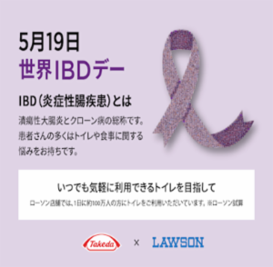 ローソンでは5月16日(火)から5月19日(金)の期間に、IBDに関して知見のある武田薬品工業(株)と共同で、全国のローソン店舗のPOSレジディスプレイ画面に「世界IBDデー」を周知する情報を表示していく。アートトイレを展開する札幌市の2店舗と、既にアートトイレを展開している東京都・神奈川県の3店舗では、トイレにIBDに関するポスターを掲出し、店舗従業員の名札下でも世界IBDデーを周知する告知を展開する。