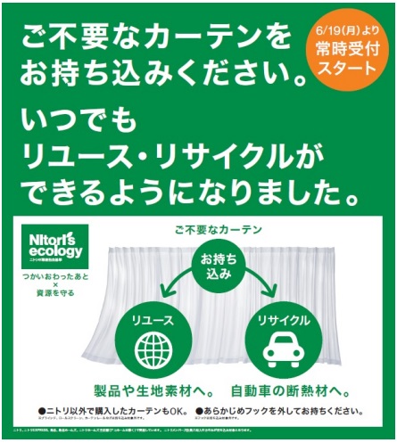 (株)ニトリ(東京都北区、武田政則社長)は、6⽉19⽇(⽉)から、全国のニトリ・ニトリEXPRESS・島忠・島忠ホームズ・ニトリホームズの店舗で、不要なカーテン持ち込みの常時受付を開始する。
