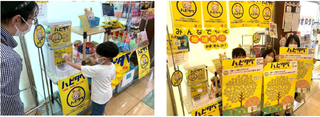 「ガチャコース」では「ハピタベシール」を10枚集めて専用台紙に貼ると、菓子や日用品などが当たるガチャを回すことができる。
