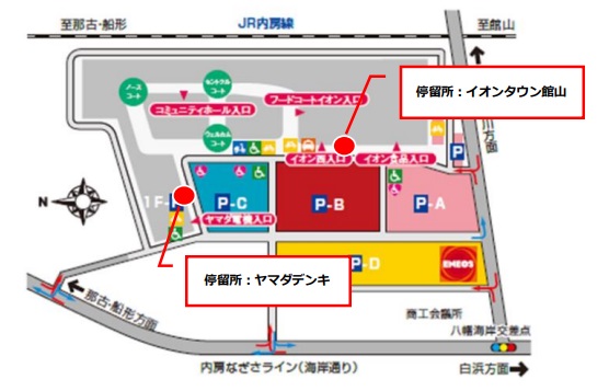 イオンタウン(株)(千葉県千葉市、加藤久誠社長)は、イオンタウン館山敷地内の一部を提供し、市街地循環バスに利用される「イオンタウン館山」・「ヤマダデンキ」の2カ所のバス停留所を設置する。