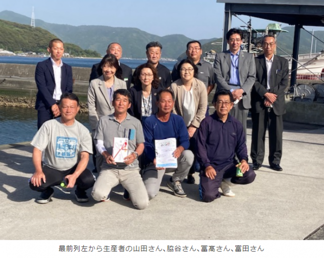 みやぎ生活協同組合・コープふくしま(宮城県仙台市)は5月24日、地域代表理事が「めぐみ野」大分県産養殖ぶりの産地、大分県佐伯市上入津を訪問し、ぶりの生産者に応援募金131万4917円と、こ~ぷ委員会のメンバーから寄せられた応援メッセージを贈呈した。