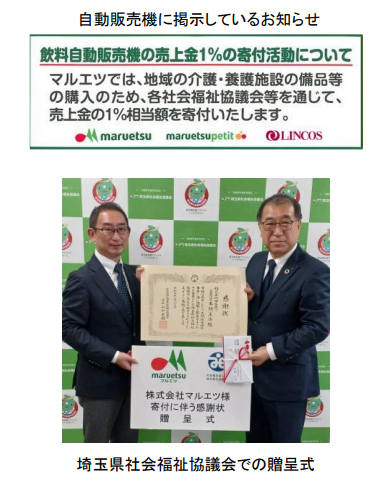 マルエツでは社会貢献活動の一環として2008年度より、全店舗の店頭および店内に設置している飲料自動販売機の売上金1%相当額を寄付する活動を行っている。今回の寄付金は2022年3月から2023年2月までの分となる。これまでに累計4717万3000円を寄付していて、地域の介護・養護施設での車いすの購入や、施設内への手すりの設置、施設内で使用するタブレットの購入に充てられている。