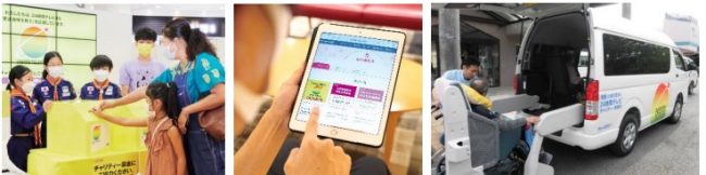 左から、イオン店頭募金の様子、WEBでのキャッシュレス募金、寄付金の支援活動の一例(福祉車両の贈呈)