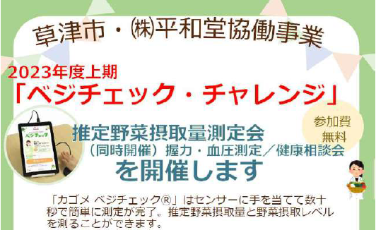 平和堂と草津市は、2022年10月から市内平和堂店舗や市施設、または大学において、無料測定会や相談会などの健康に関する取り組みを定期的に実施している。今回は開催会場や日数を増やして開催する。開催会場は「フレンドマート追分店」「フレンドマート草津大路店」「キラリエ草津」「フレンドマート南草津店」「フレンドマート上笠店」「アル・プラザ草津」の6店舗。