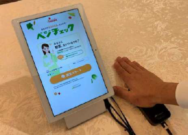 「ベジチェック®」は、センサーに手のひらを当てて数十秒程度で測量が終了する。野菜摂取レベルと推定野菜摂取量の2つの結果が表示される。