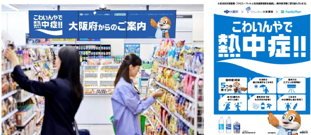 大阪府内には小売チェーンとして最多の1300店以上の店舗があり、そのうち約400店のファミリーマート店内に設置されたデジタルサイネージにおいて、動画と音声で熱中症対策のポイントを啓発していく。