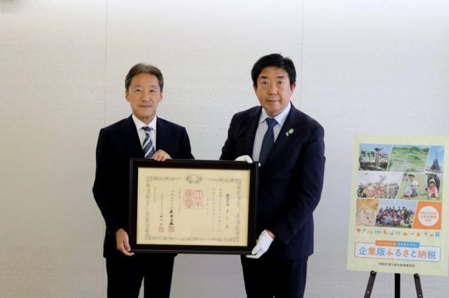 7月4日(火)に前橋市役所で執り行われた伝達式では、カインズの高家正行社長CEOが前橋市の山本市長から褒状を受け取った。