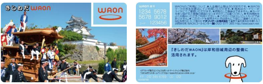 その取り組みの一環として、7月11日(火)にご当地WAON「きしわだWAON」を発行した。カードの表面には、岸和田城と岸和田だんじり祭をデザインしてあり、裏面は大威徳寺、桜の岸和田城、五風荘の写真を載せている。「きしわだWAON」を利用した売上金額の一部は岸和田市に寄付され、岸和田市は岸和田城周辺の整備に活用する。